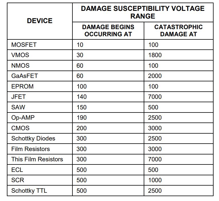 將表中的值進(jìn)行快速比較,列出了檢測(cè)儀器件的敏感性水平,這說(shuō)明了為什么《半導(dǎo)體可靠性新聞》估計(jì)大約 60% 的器件故障是由靜電損壞造成的釋放。