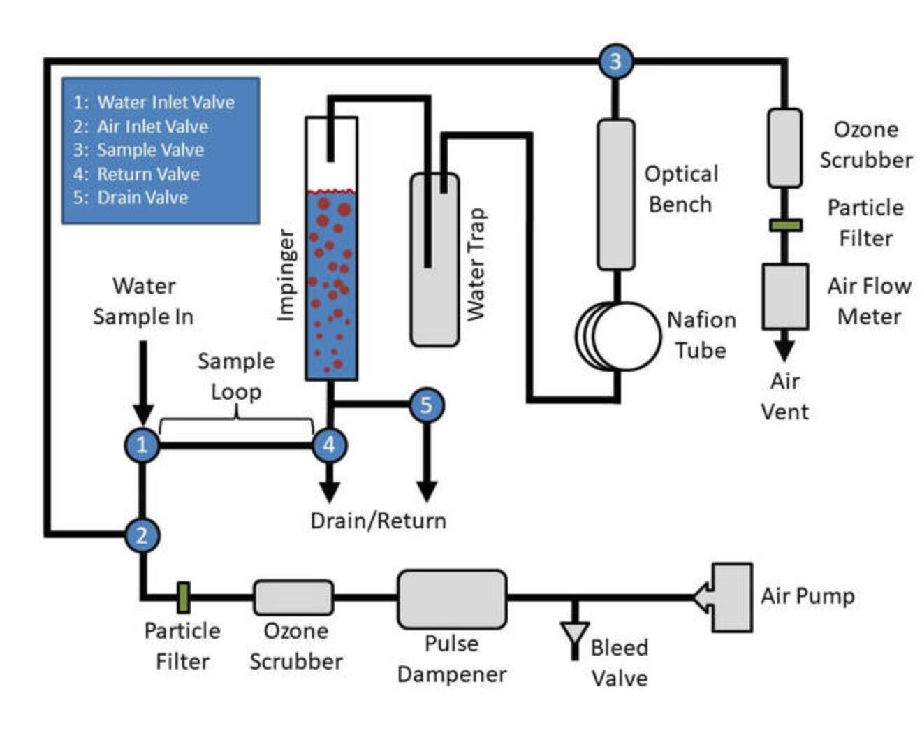 下面的示意圖顯示了儀器操作所需的附加組件。其中包括用于調(diào)節(jié)空氣流速的放氣閥、用于減少氣流波動的脈沖阻尼器、用于從環(huán)境空氣中去除臭氧的臭氧洗滌器用于噴射樣品并從排出的空氣中洗滌臭氧、空氣顆粒過濾器、用于保護空氣的集水器光學(xué)平臺暴露于液態(tài)水,Nafion 管平衡環(huán)境空氣的濕度,以及空氣流量計。