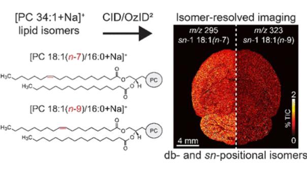 組織內(nèi)脂質(zhì)的質(zhì)譜成像(MSI)在生物分子發(fā)現(xiàn)和組織病理學(xué)應(yīng)用方面具有重要潛力。然而,傳統(tǒng)的MSI技術(shù)受到了磷脂區(qū)域異構(gòu)體的普遍存在的挑戰(zhàn),這些異構(gòu)體僅在碳-碳雙鍵的位置和/或脂肪酰基與甘油主鏈的相對位置(即sn位置)上有所不同。成像實驗中無法解析異構(gòu)體脂質(zhì)掩蓋了潛在的復(fù)雜性,導(dǎo)致代謝信息的嚴重丟失。在此,臭氧誘導(dǎo)解離(OzID)在能夠進行基質(zhì)輔助激光解吸/電離(MALDI)的遷移率啟用四極飛行時間(Q-TOF)質(zhì)譜儀上實現(xiàn)。利用Q-TOF中的離子遷移區(qū),獲得了高數(shù)量密度的臭氧,導(dǎo)致∼與早期MALDI OzID實施相比,OzID產(chǎn)物離子豐度提高了1000倍。將這種提升轉(zhuǎn)化為成像導(dǎo)致采集率提高了50倍,有助于磷脂異構(gòu)體分辨率的大面積繪圖。繪制大鼠腦切片的異構(gòu)體分布圖揭示了脂質(zhì)異構(gòu)體群體的不同分布,其雙鍵和sn位置不同的異構(gòu)體的區(qū)域特異性關(guān)聯(lián)。此外,由臭氧和碰撞誘導(dǎo)的連續(xù)離解產(chǎn)生的產(chǎn)物離子在非經(jīng)典sn-1位置酯化的不飽和脂肪酰基鏈中實現(xiàn)了雙鍵分配。