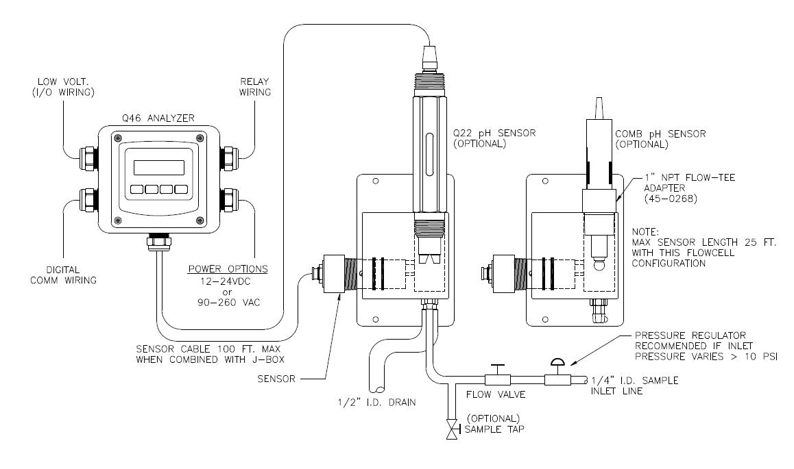 標準型號 Q46H/64 系統(tǒng)包括三個主要組件:Q46H 分析儀、恒壓頭流通池和臭氧傳感器。密封流通池也可用于可以仔細控制樣品流速和壓力的應(yīng)用。圖 1 顯示了一個典型的安裝。